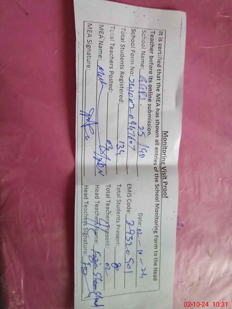 | Attendance Register | Head Teacher | MEA with School | Visit Proof |