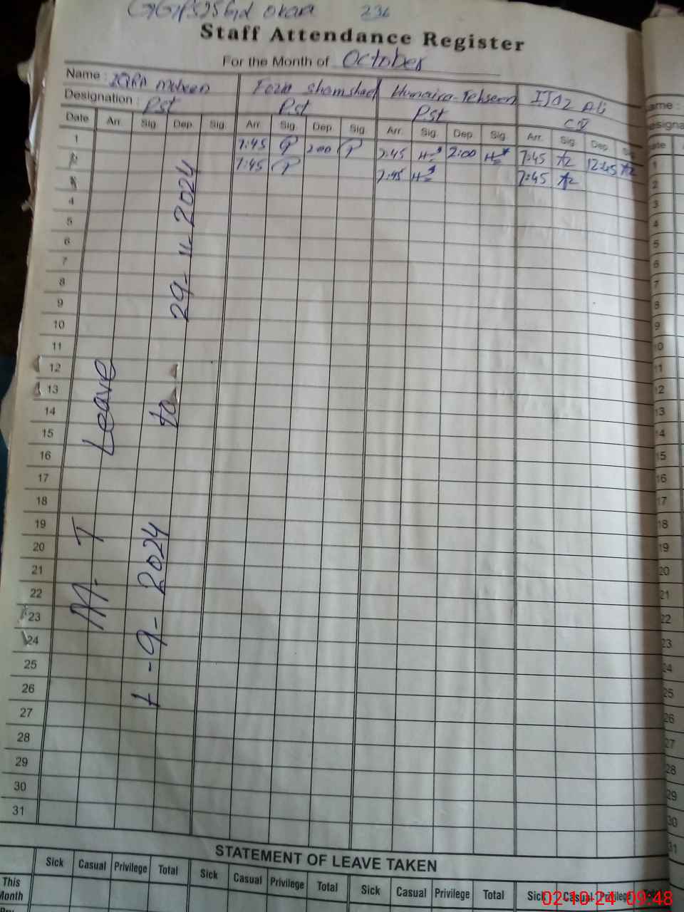 | Leave | Duty | Absent | Maternity | Medical | Ex- Pak |