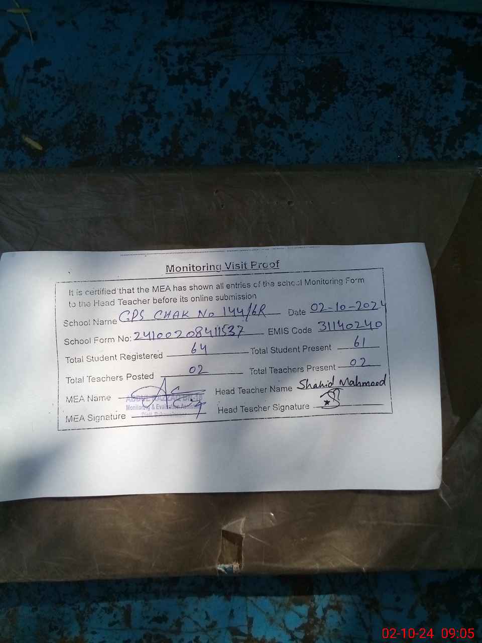 | Attendance Register | Head Teacher | MEA with School | Visit Proof |