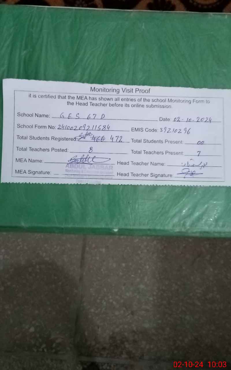 | EMIS Code: 39210296 | Name of School: GHS 67 D | |||