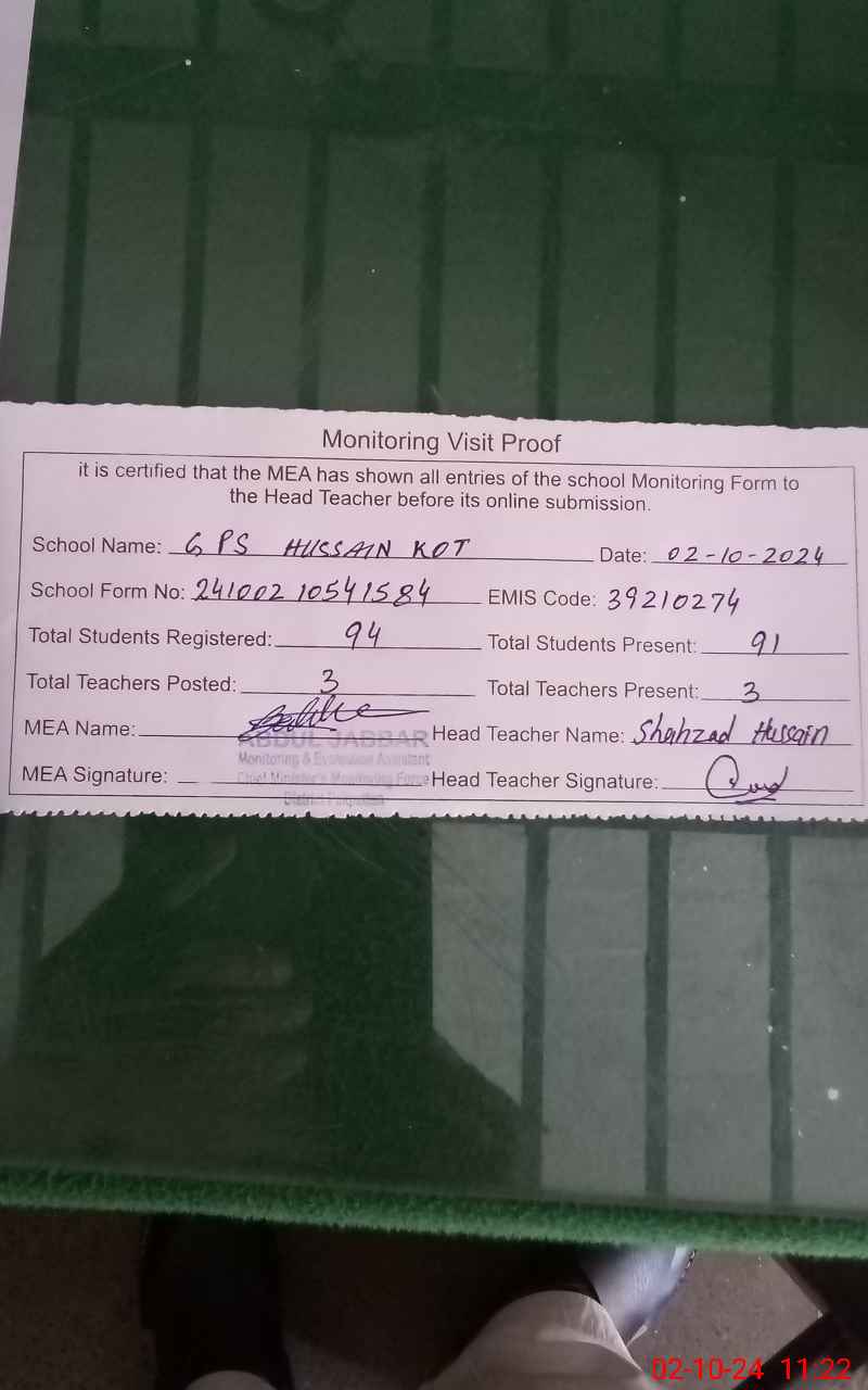 | EMIS Code: 39210274 | Name of School: GPS HUSSAIN KOT | |||