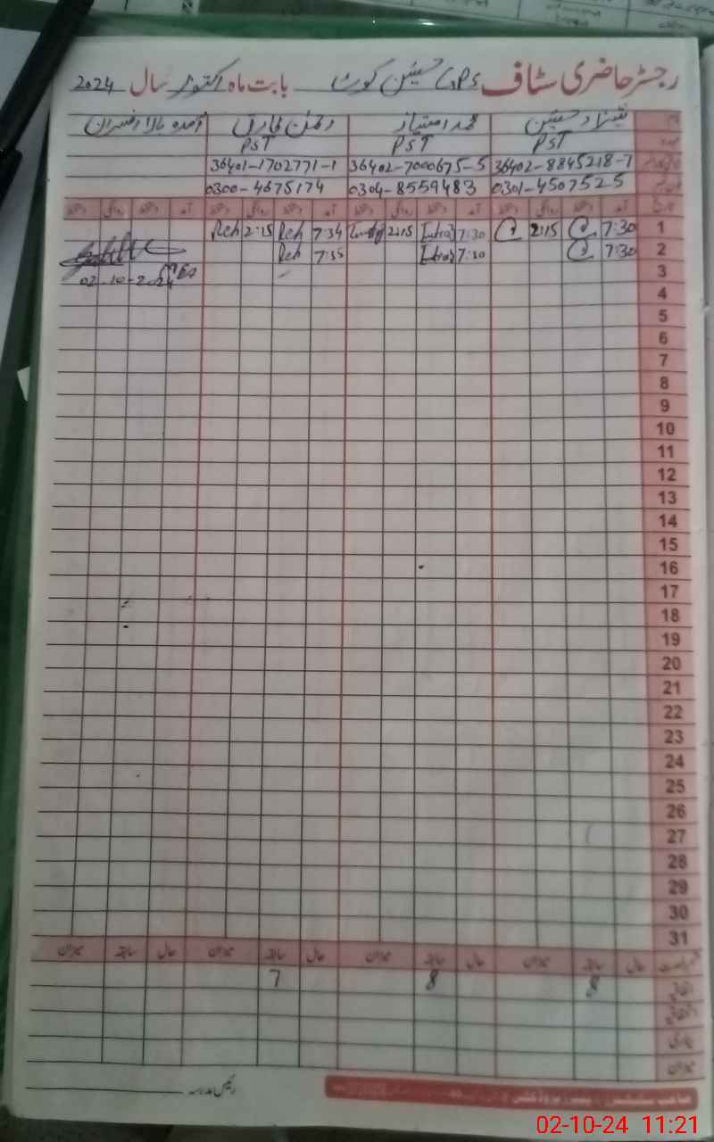 | CNIC | Full Name | Designation | R/C | Absence During Last Calender Month |