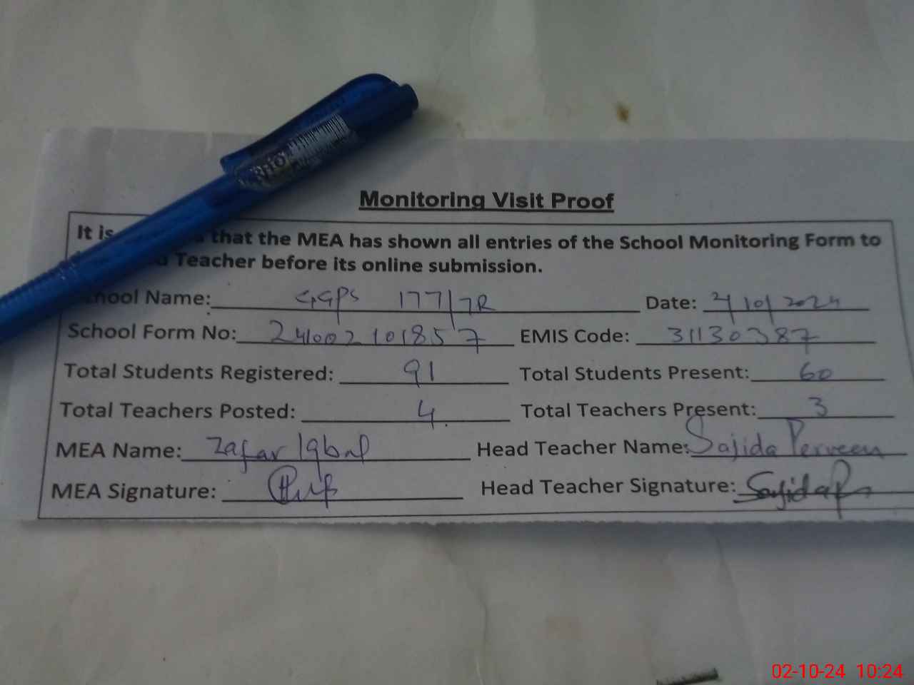 | Monitoring Date: 02-10-2024 | Start Time: 02-10-2024 09:57 AM | End Time: 02-10-2024 10:25 AM | Name of MEA: Za**** Iq**** BN**** | |