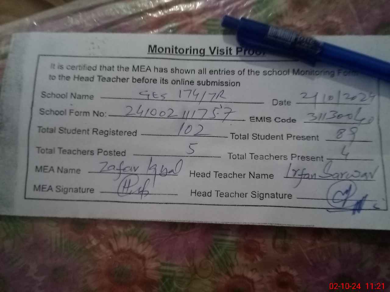 | Monitoring Date: 02-10-2024 | Start Time: 02-10-2024 10:58 AM | End Time: 02-10-2024 11:22 AM | Name of MEA: Za**** Iq**** BN**** | |