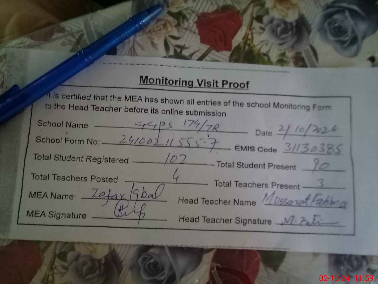 | Monitoring Date: 02-10-2024 | Start Time: 02-10-2024 11:41 AM | End Time: 02-10-2024 11:59 AM | Name of MEA: Za**** Iq**** BN**** | |