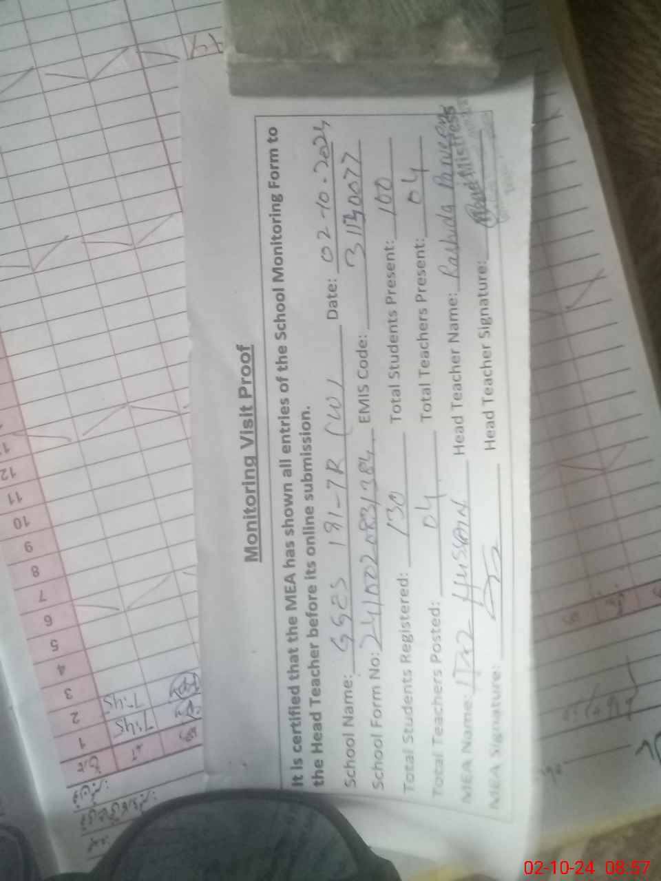| Attendance Register | Head Teacher | MEA with School | Visit Proof |