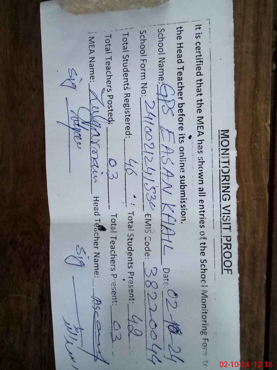 | EMIS Code: 38220044 | Name of School: GPS EASAN KHAIL | |||
