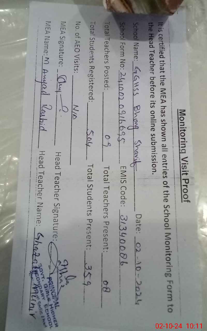 | EMIS Code: 31340086 | Name of School: GGHSS BHONG SHARIF | |||