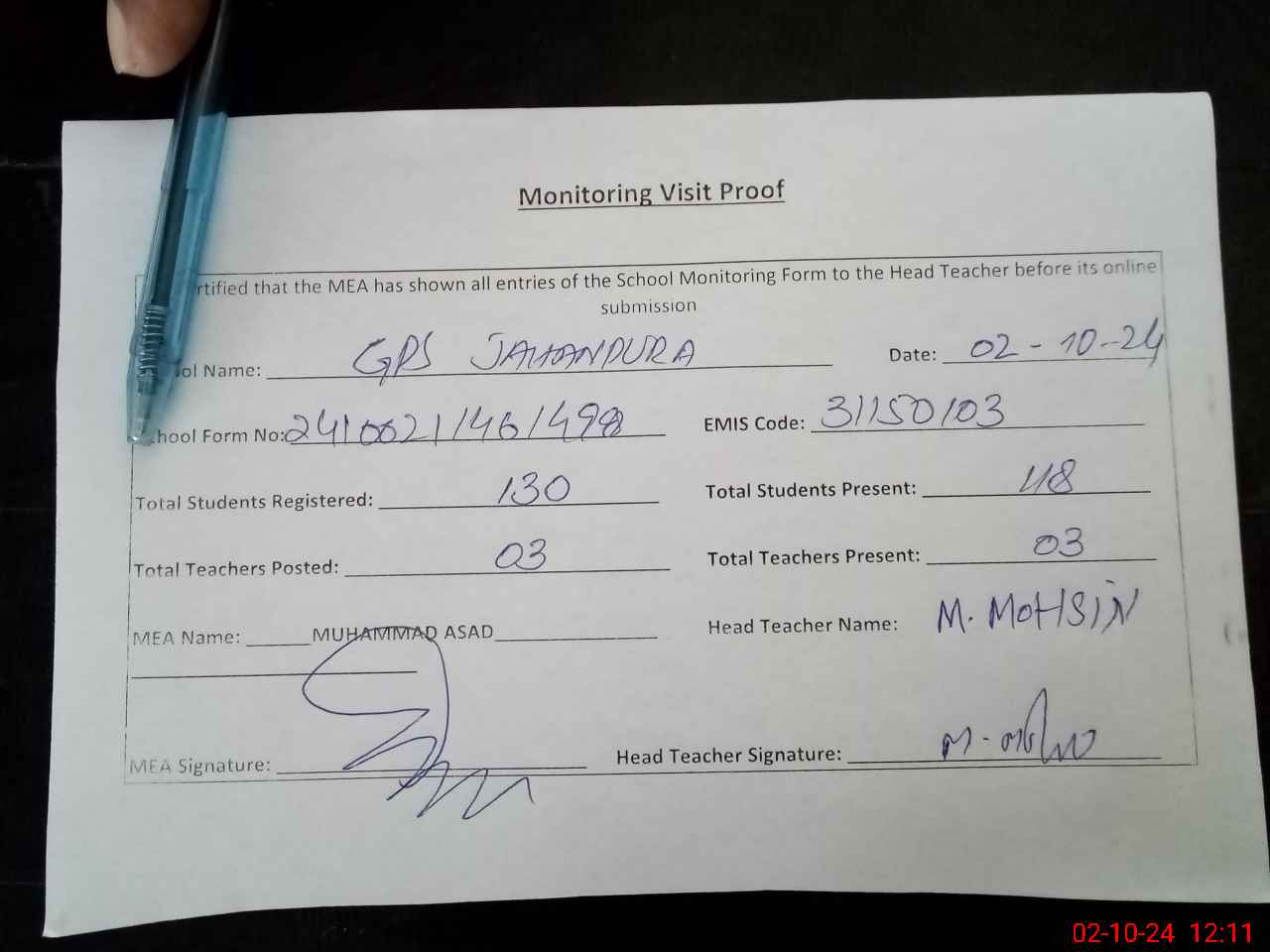 | Attendance Register | Head Teacher | MEA with School | Visit Proof |