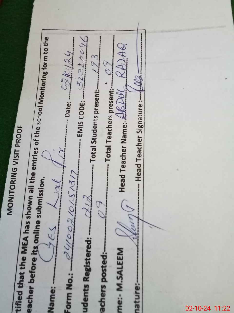 | Attendance Register | Head Teacher | MEA with School | Visit Proof |