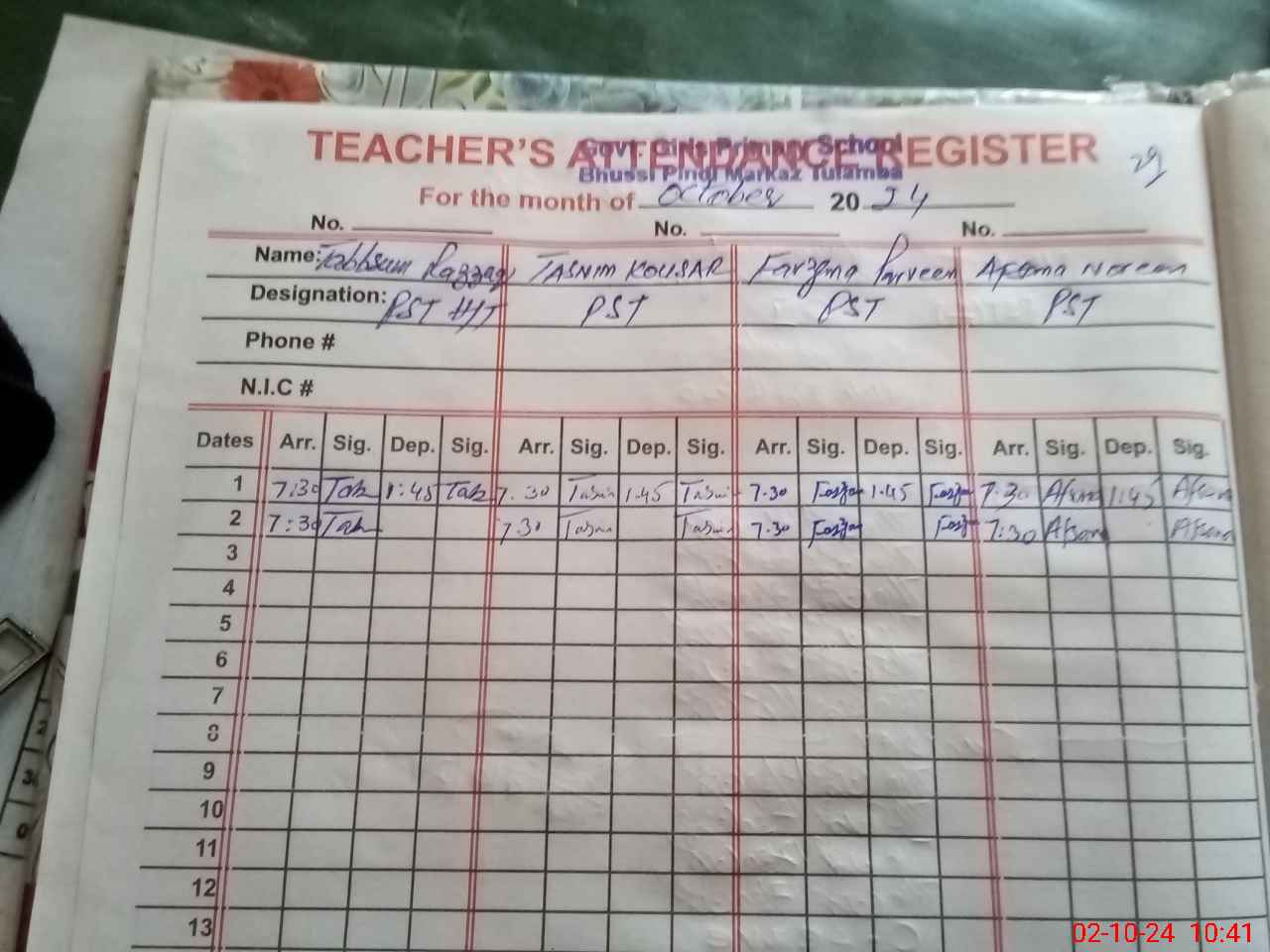 | Name: TA**** RA**** Designation: (School Headmaster's/Headmistress's) PST Phone/Cell Number: 03**** |