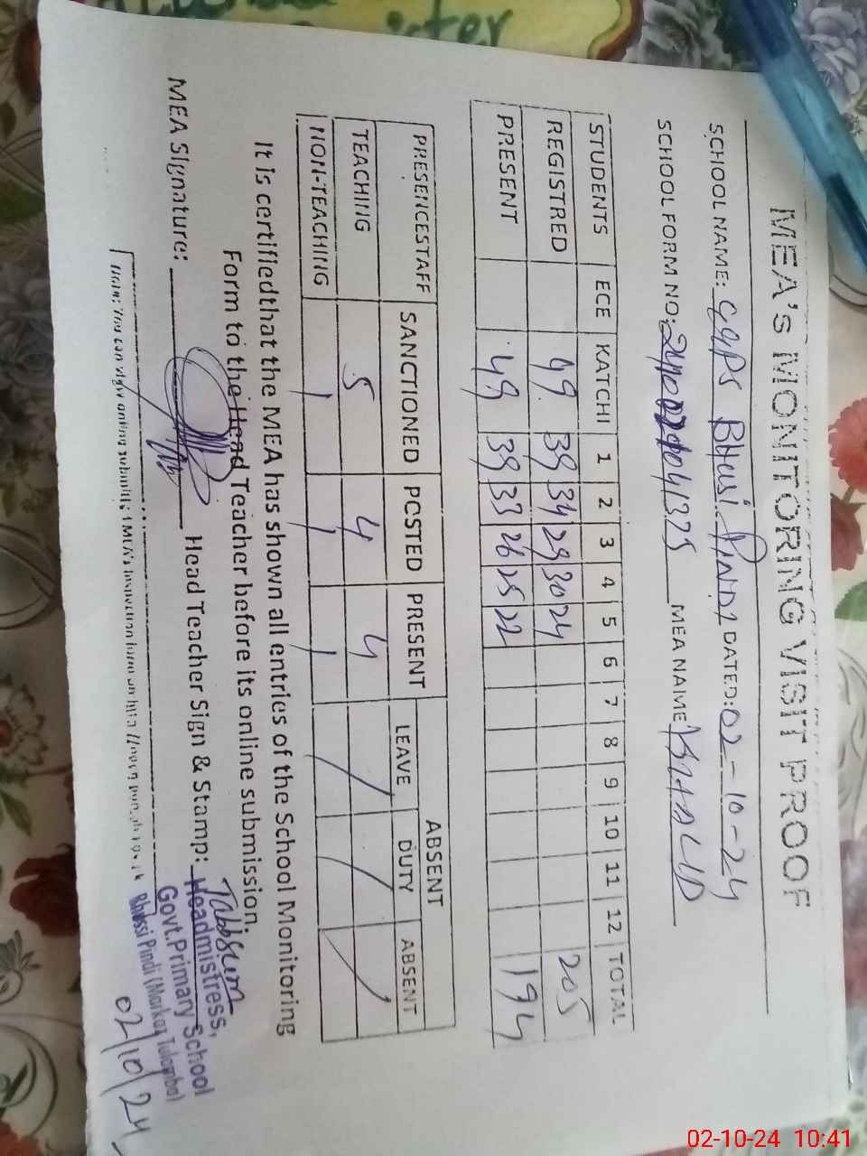 | Certified that this School was Inspected by the Undersigned MEA/DMO Today and the Information Stated Above is as Per Record. | |||||