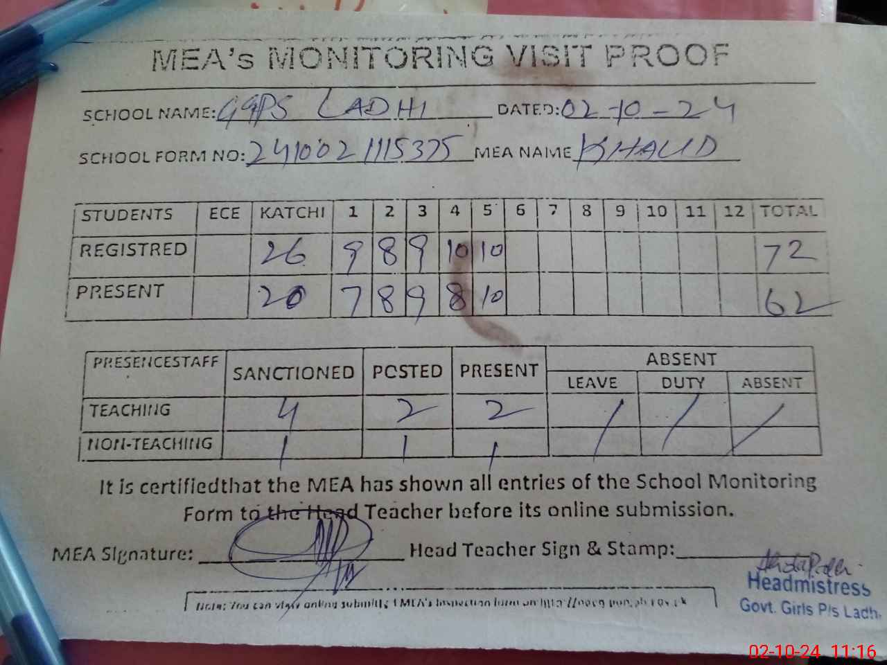 | EMIS Code: 36430370 | Name of School: GGPS LADHI, TULAMBA | |||