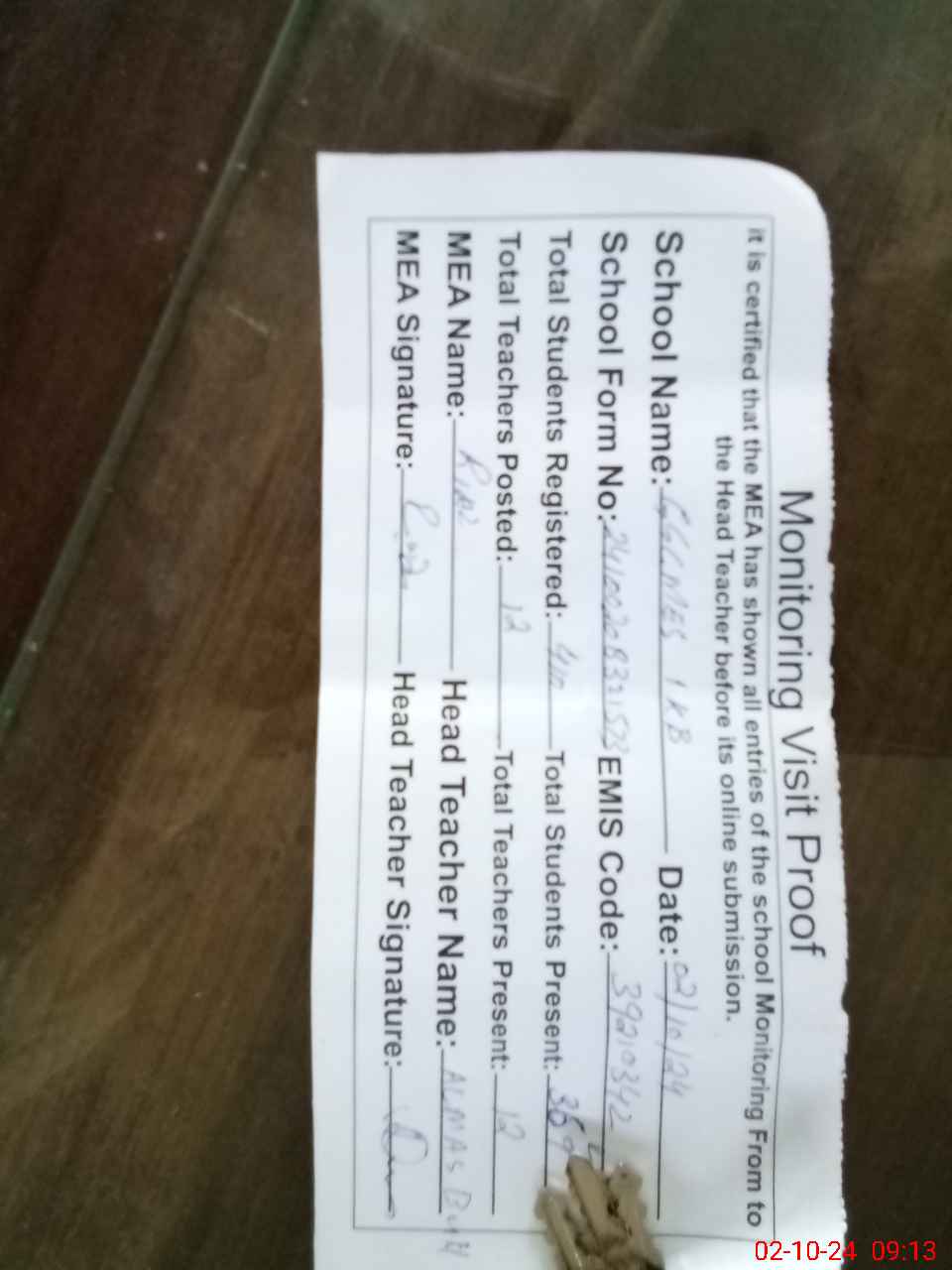 | Attendance Register | Head Teacher | MEA with School | Visit Proof |