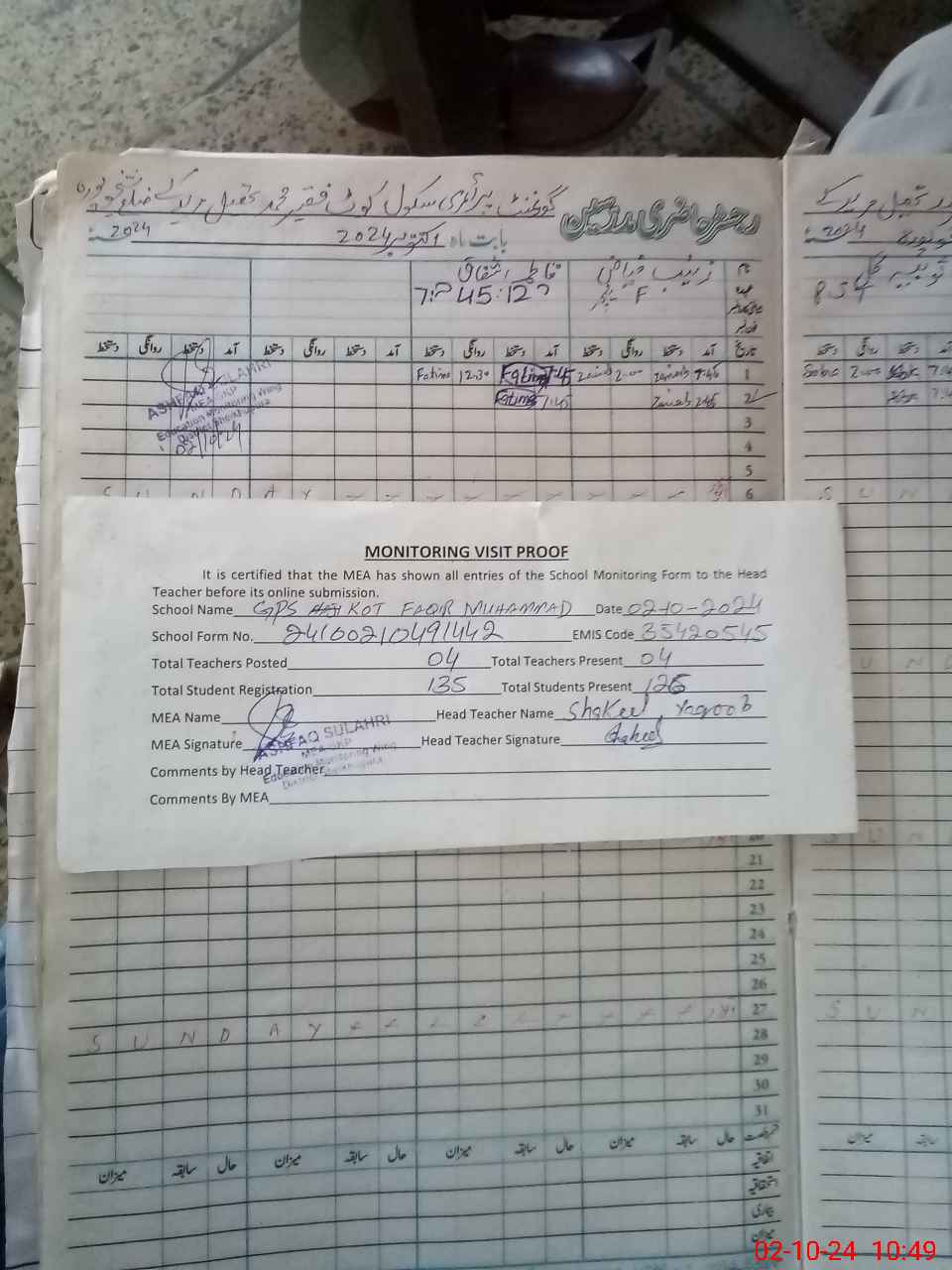 | Attendance Register | Head Teacher | MEA with School | Visit Proof |