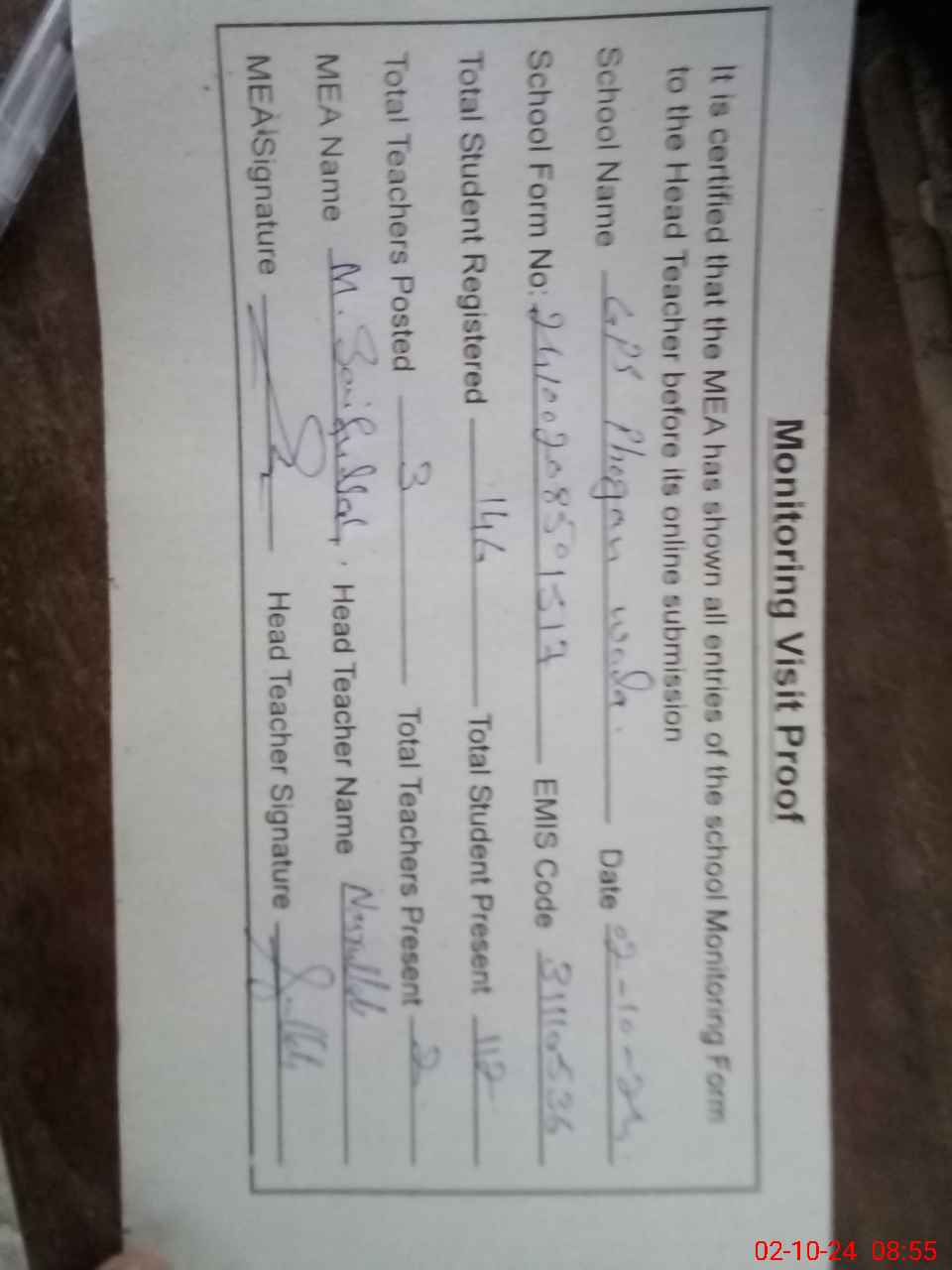 | Remarks (Use Separate Page if Required): Teacher Parvez Akhtar found absent Old books also delivered to students Boundary wall hight less 01 Toilet repair in progress | |||||