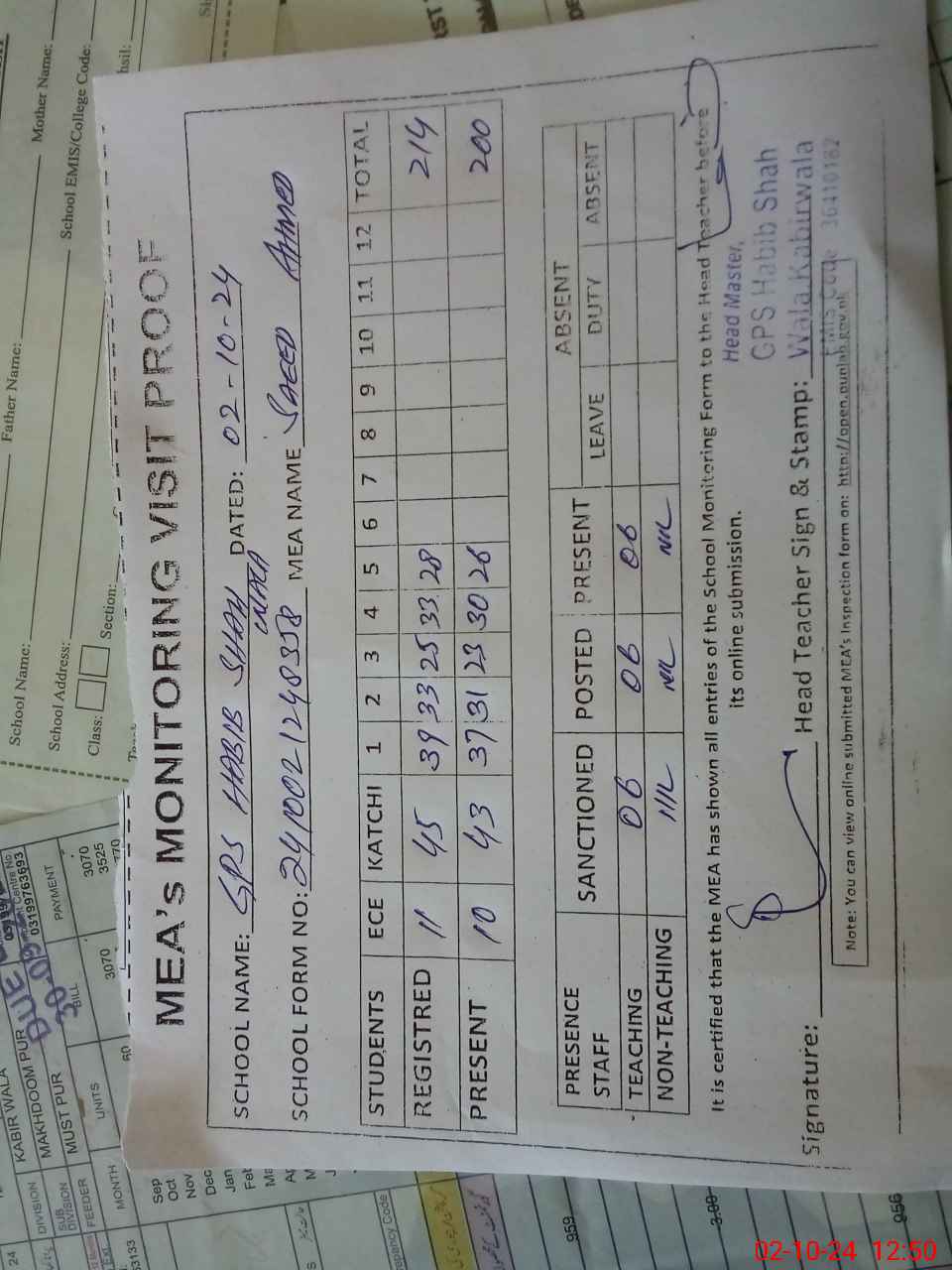 | Attendance Register | Head Teacher | MEA with School | Visit Proof |