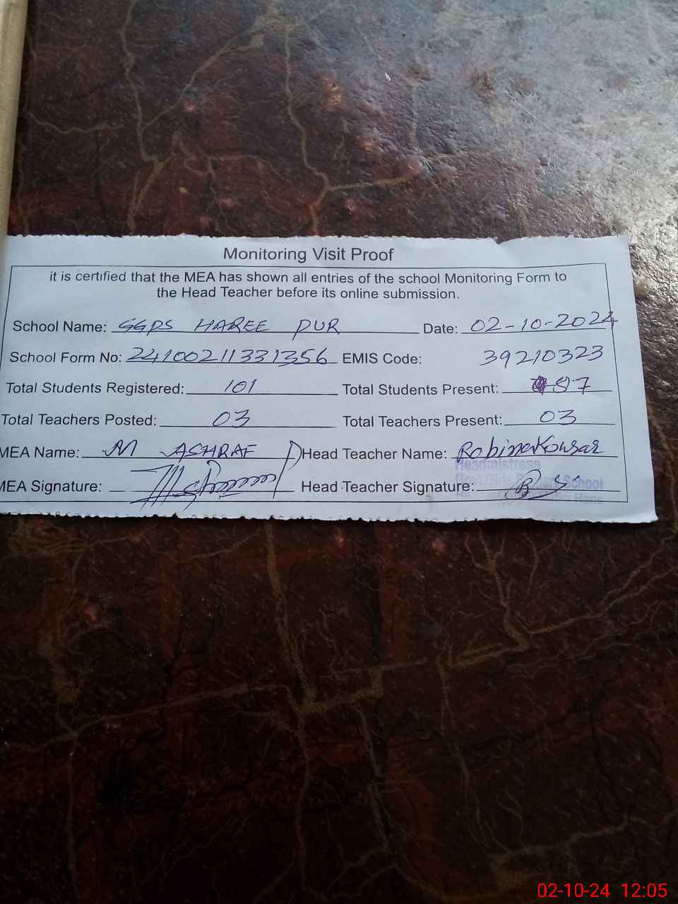 | Attendance Register | Head Teacher | MEA with School | Visit Proof |