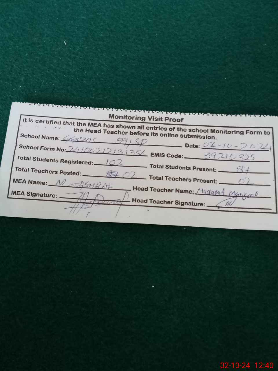 | Monitoring Date: 02-10-2024 | Start Time: 02-10-2024 12:13 PM | End Time: 02-10-2024 12:40 PM | Name of MEA: MU**** AS**** | |