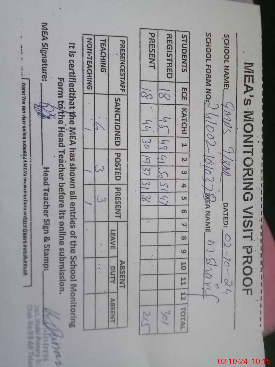 | Monitoring Date: 02-10-2024 | Start Time: 02-10-2024 08:29 AM | End Time: 02-10-2024 10:17 AM | Name of MEA: MU**** SH**** | |