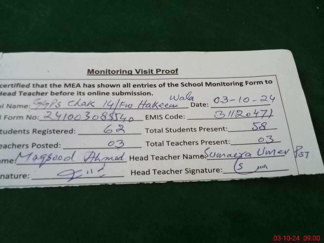 | Monitoring Date: 03-10-2024 | Start Time: 03-10-2024 08:40 AM | End Time: 03-10-2024 09:01 AM | Name of MEA: Ma**** Ah**** BN**** 20 | |