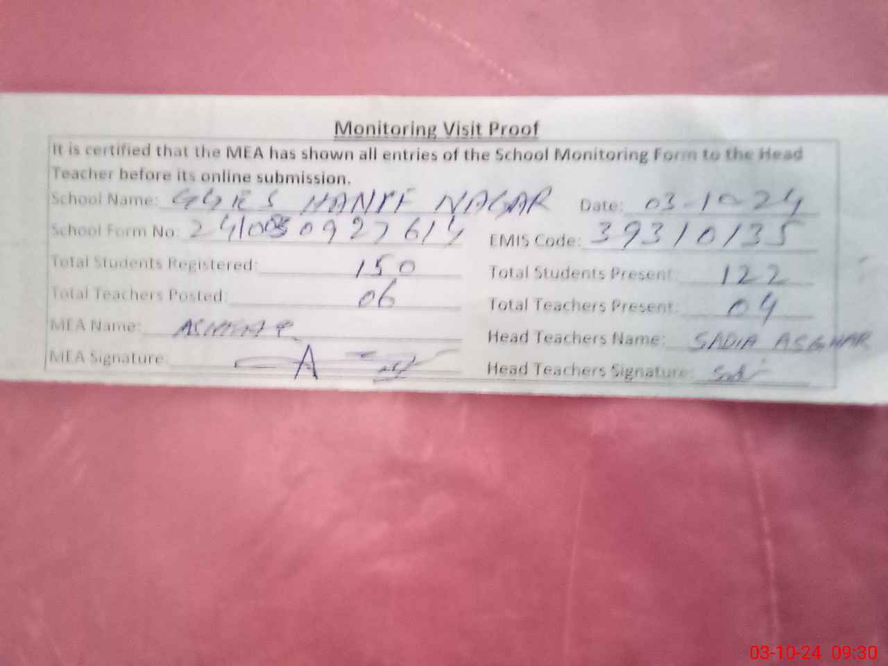 | Certified that this School was Inspected by the Undersigned MEA/DMO Today and the Information Stated Above is as Per Record. | |||||