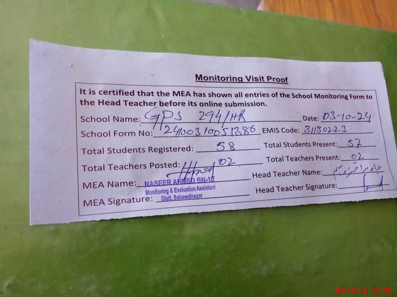 | EMIS Code: 31130223 | Name of School: GPS CHAK NO 294 HR | |||