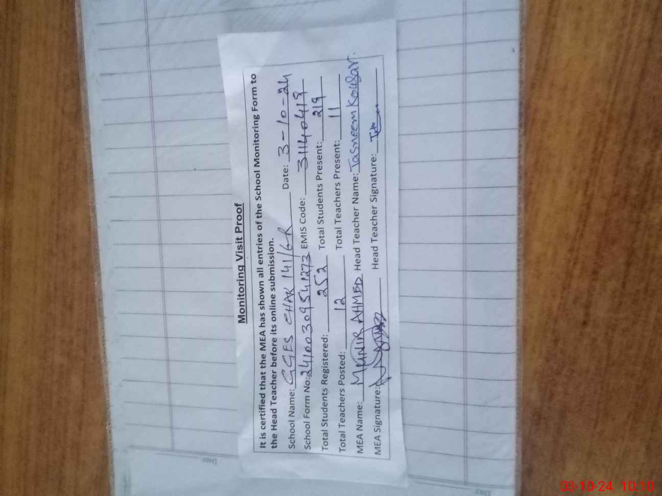 | Monitoring Date: 03-10-2024 | Start Time: 03-10-2024 09:30 AM | End Time: 03-10-2024 10:12 AM | Name of MEA: Mu**** Ah**** BN39 | |