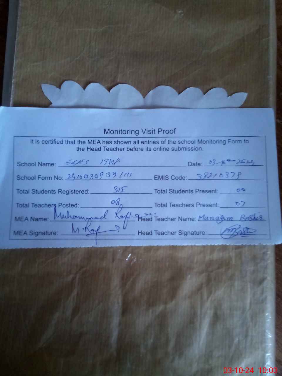 | Certified that this School was Inspected by the Undersigned MEA/DMO Today and the Information Stated Above is as Per Record. | |||||