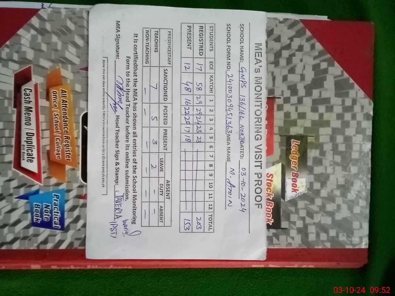 | Attendance Register | Head Teacher | MEA with School | Visit Proof |