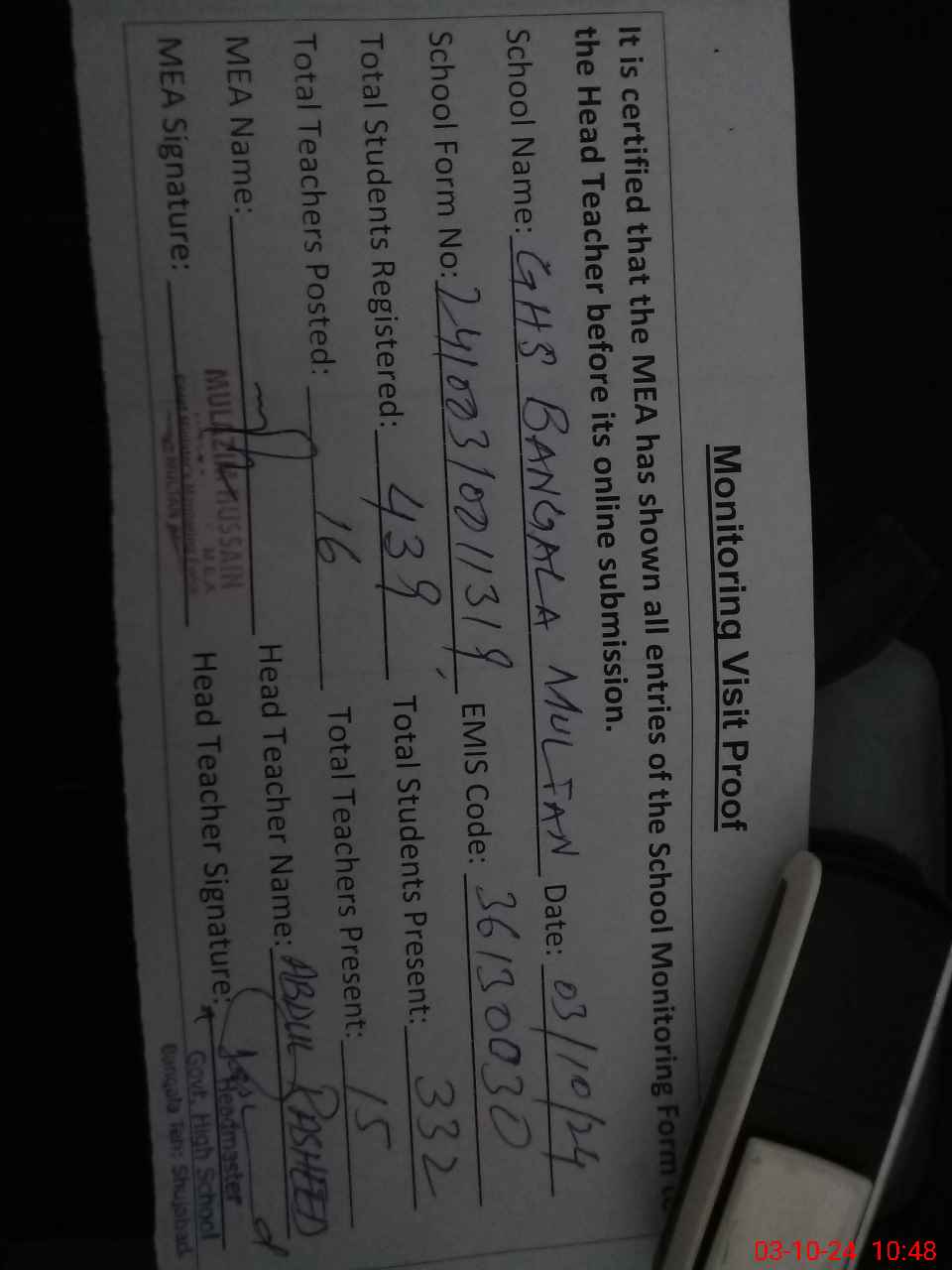 | Certified that this School was Inspected by the Undersigned MEA/DMO Today and the Information Stated Above is as Per Record. | |||||