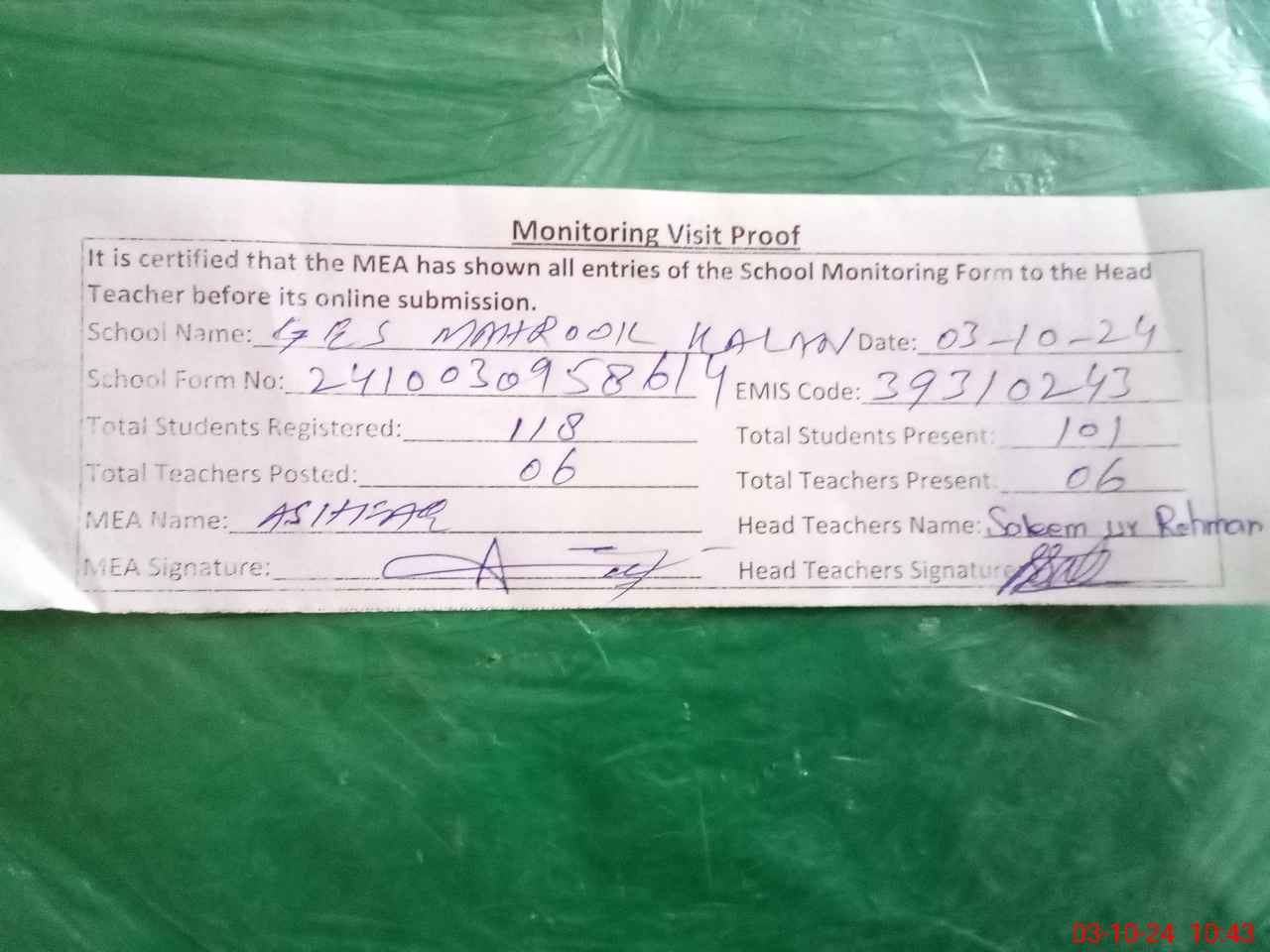 | EMIS Code: 39310243 | Name of School: GES MAHROOK KALAN | |||