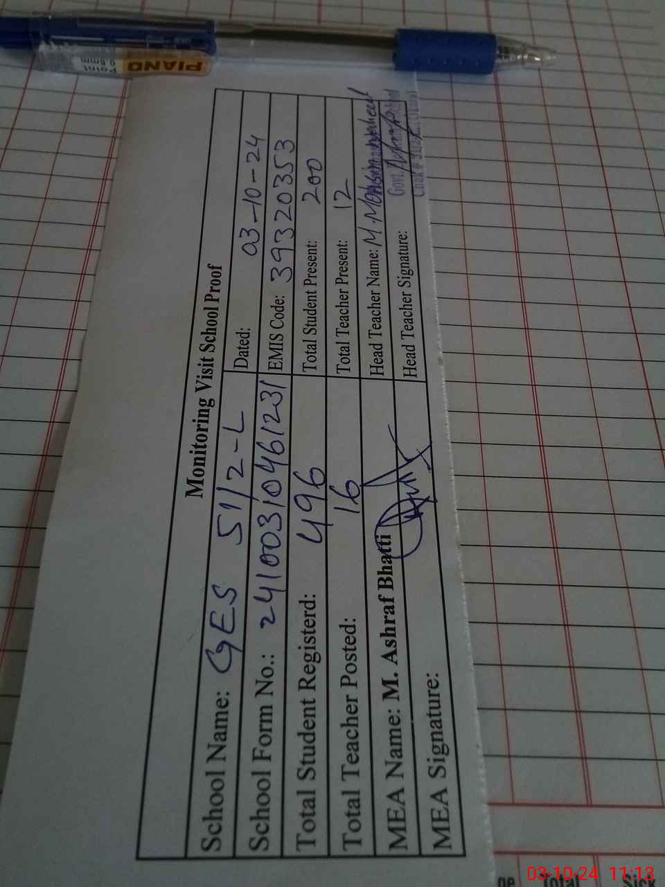 | Attendance Register | Head Teacher | MEA with School | Visit Proof |