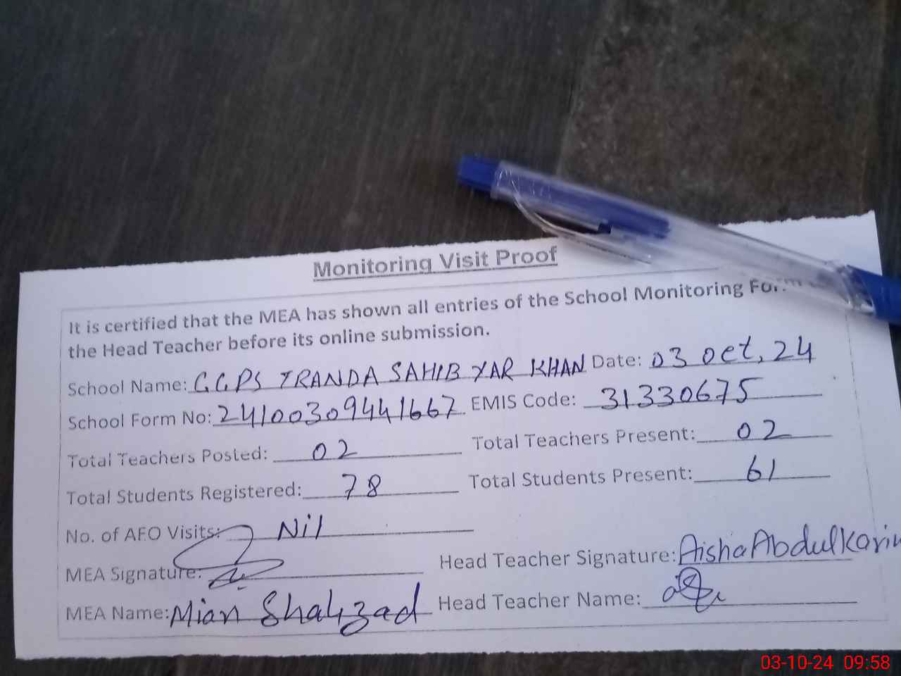 | Attendance Register | Head Teacher | MEA with School | Visit Proof |