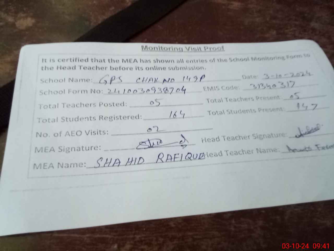 | Attendance Register | Head Teacher | MEA with School | Visit Proof |