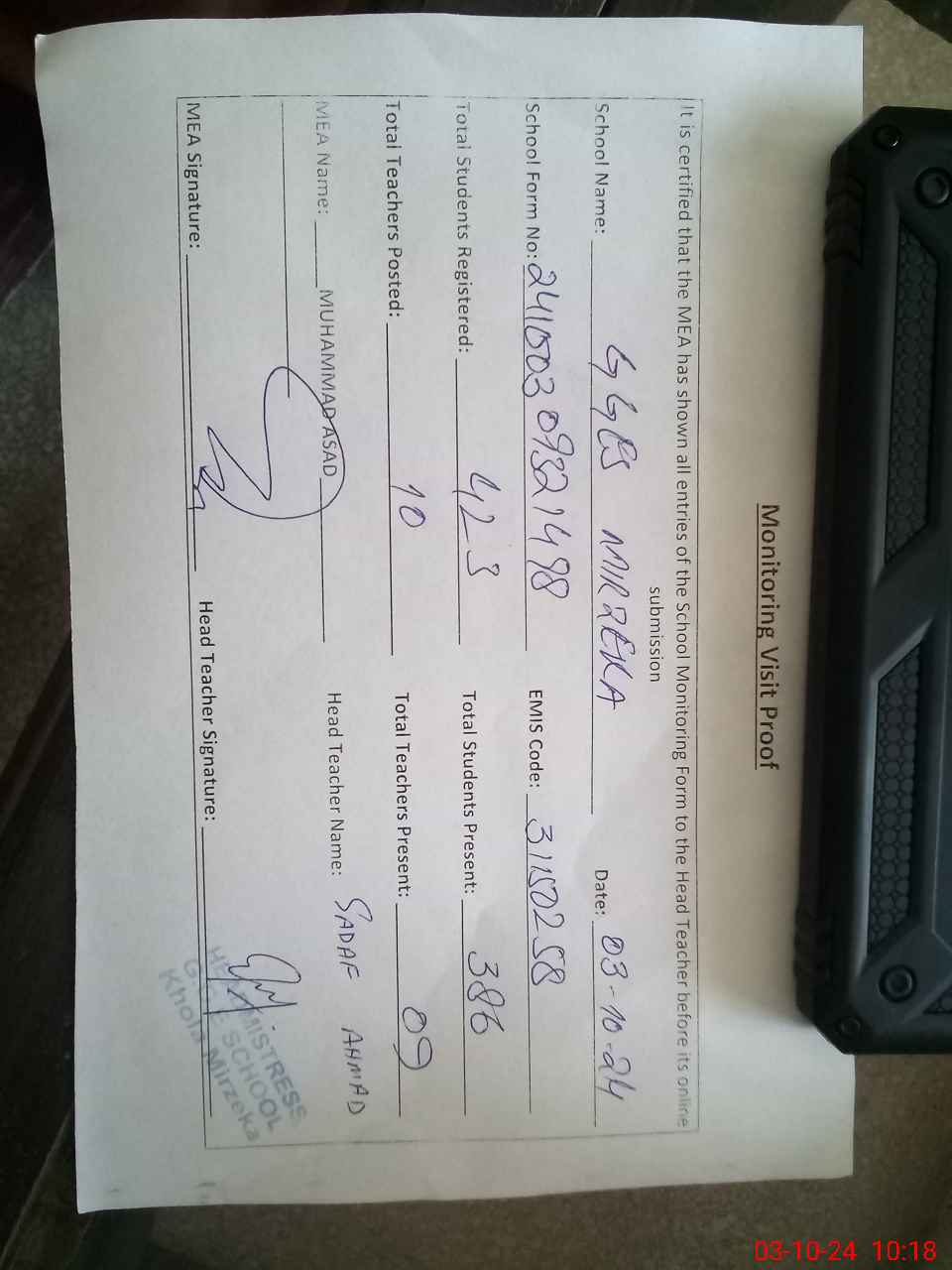 | EMIS Code: 31150258 | Name of School: GGHS KHOL MIRZEKA | |||
