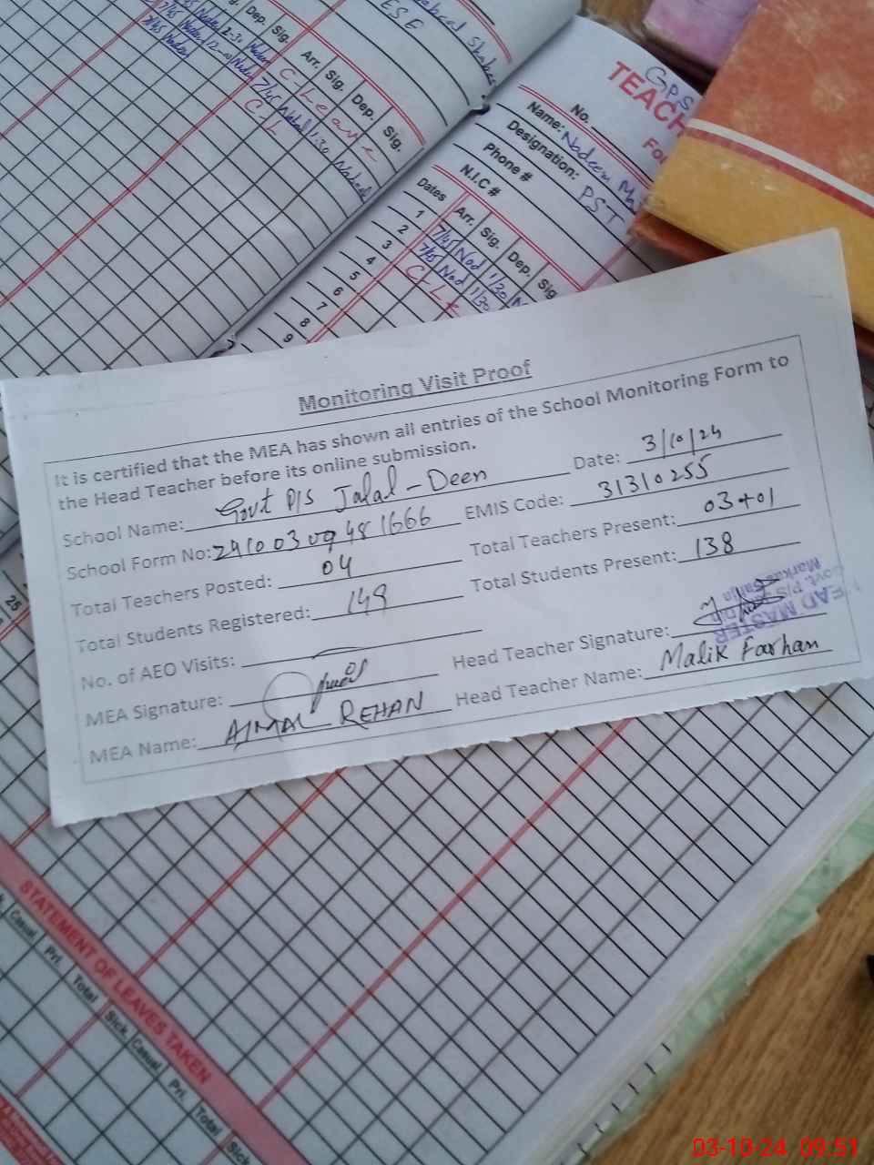 | Attendance Register | Head Teacher | MEA with School | Visit Proof |