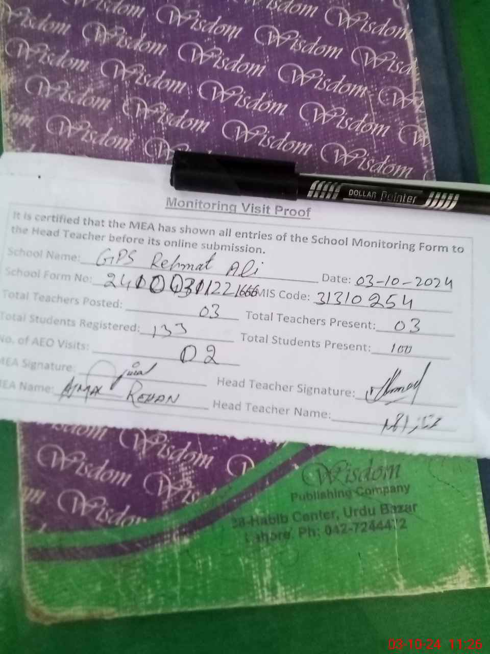 | Attendance Register | Head Teacher | MEA with School | Visit Proof |