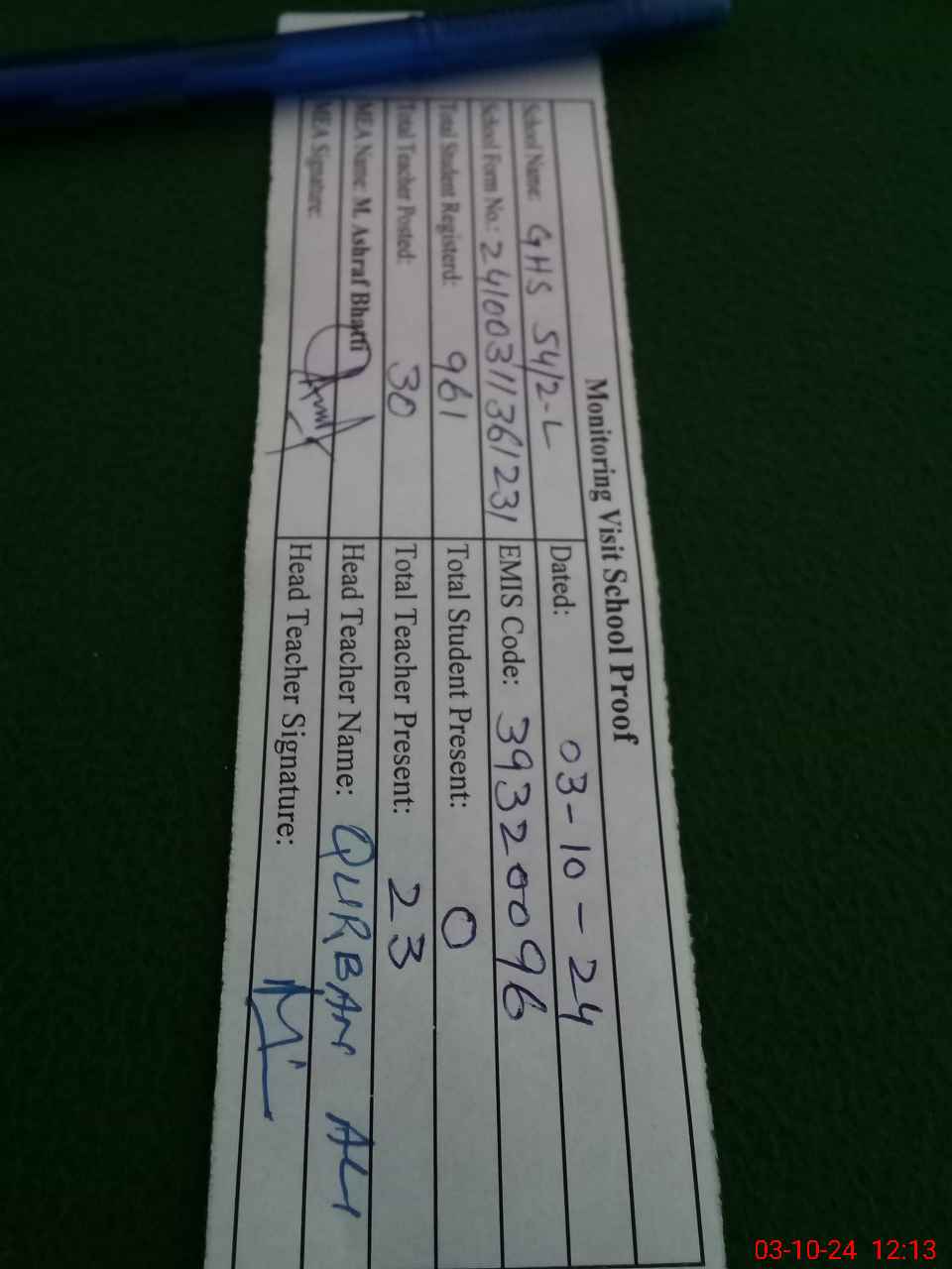 | Attendance Register | Head Teacher | MEA with School | Visit Proof |