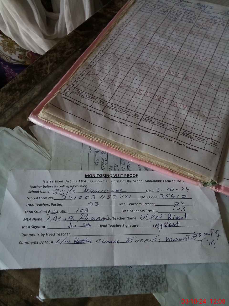 | Attendance Register | Head Teacher | MEA with School | Visit Proof |