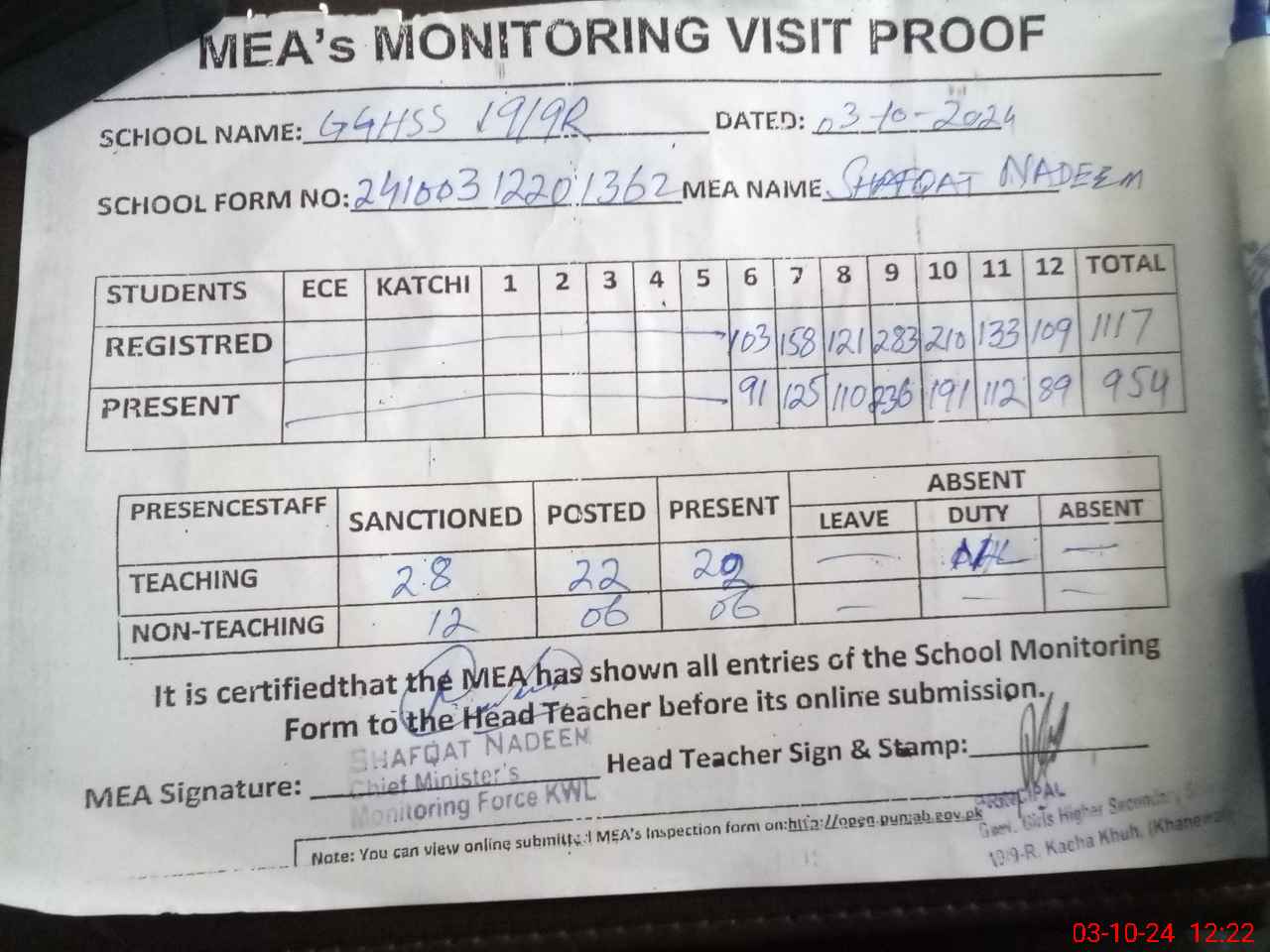 | Certified that this School was Inspected by the Undersigned MEA/DMO Today and the Information Stated Above is as Per Record. | |||||