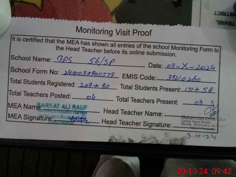 | EMIS Code: 39210260 | Name of School: GPS CHAK NO. 56 SP | |||