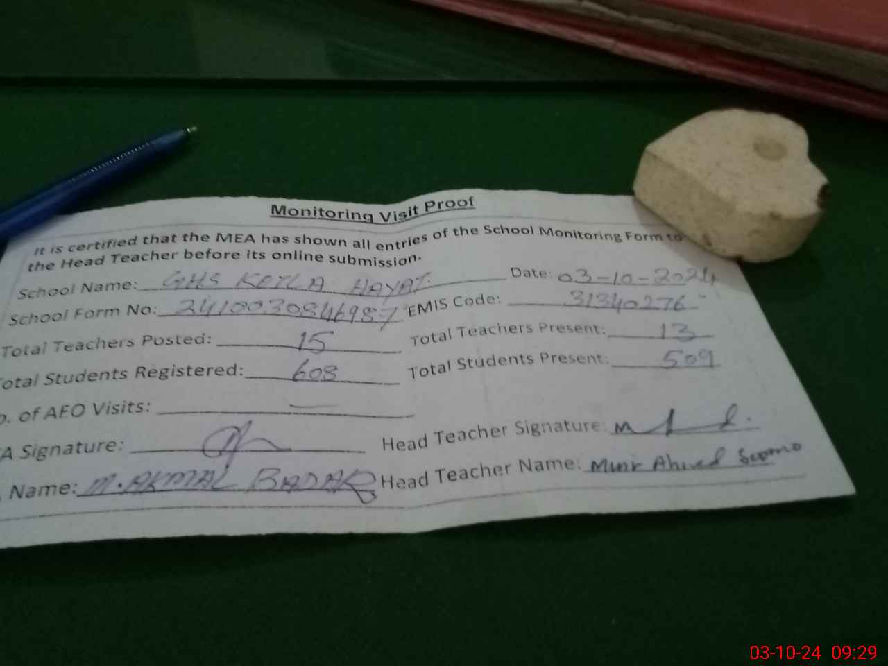 | Attendance Register | Head Teacher | MEA with School | Visit Proof |