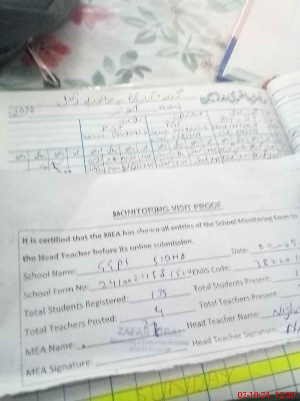 | Certified that this School was Inspected by the Undersigned MEA/DMO Today and the Information Stated Above is as Per Record. | |||||
