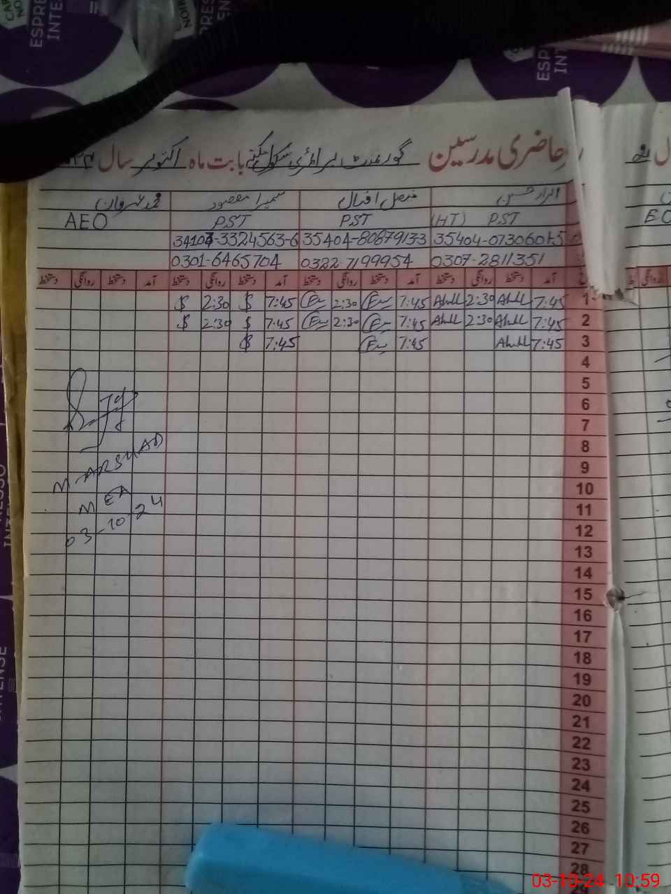 | Name: AB**** HU**** Designation: (School Headmaster's/Headmistress's) PST Phone/Cell Number: 03**** |