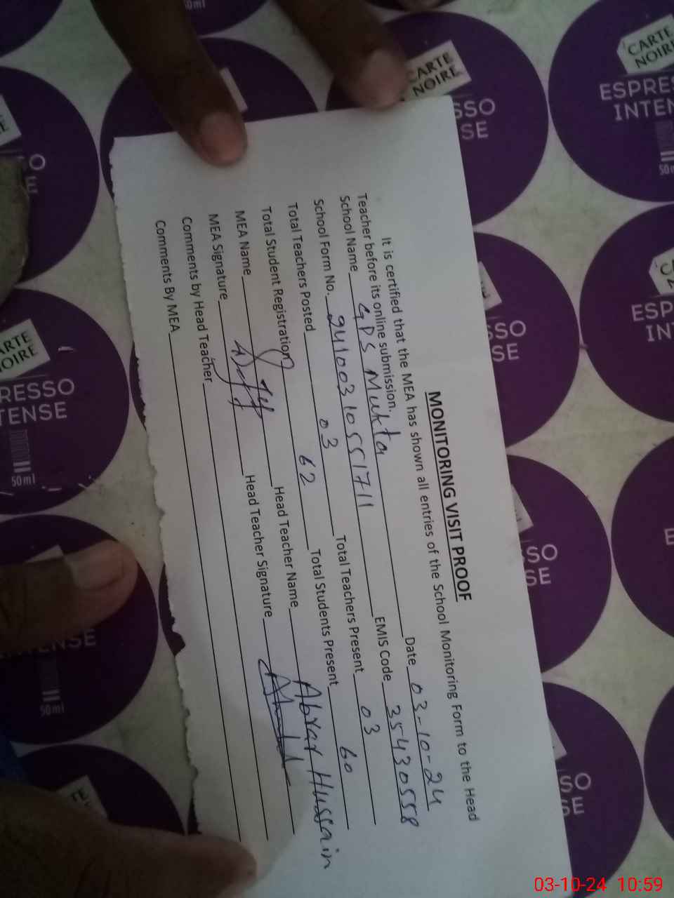| Monitoring Date: 03-10-2024 | Start Time: 03-10-2024 10:19 AM | End Time: 03-10-2024 11:00 AM | Name of MEA: Mu**** Ar**** | |