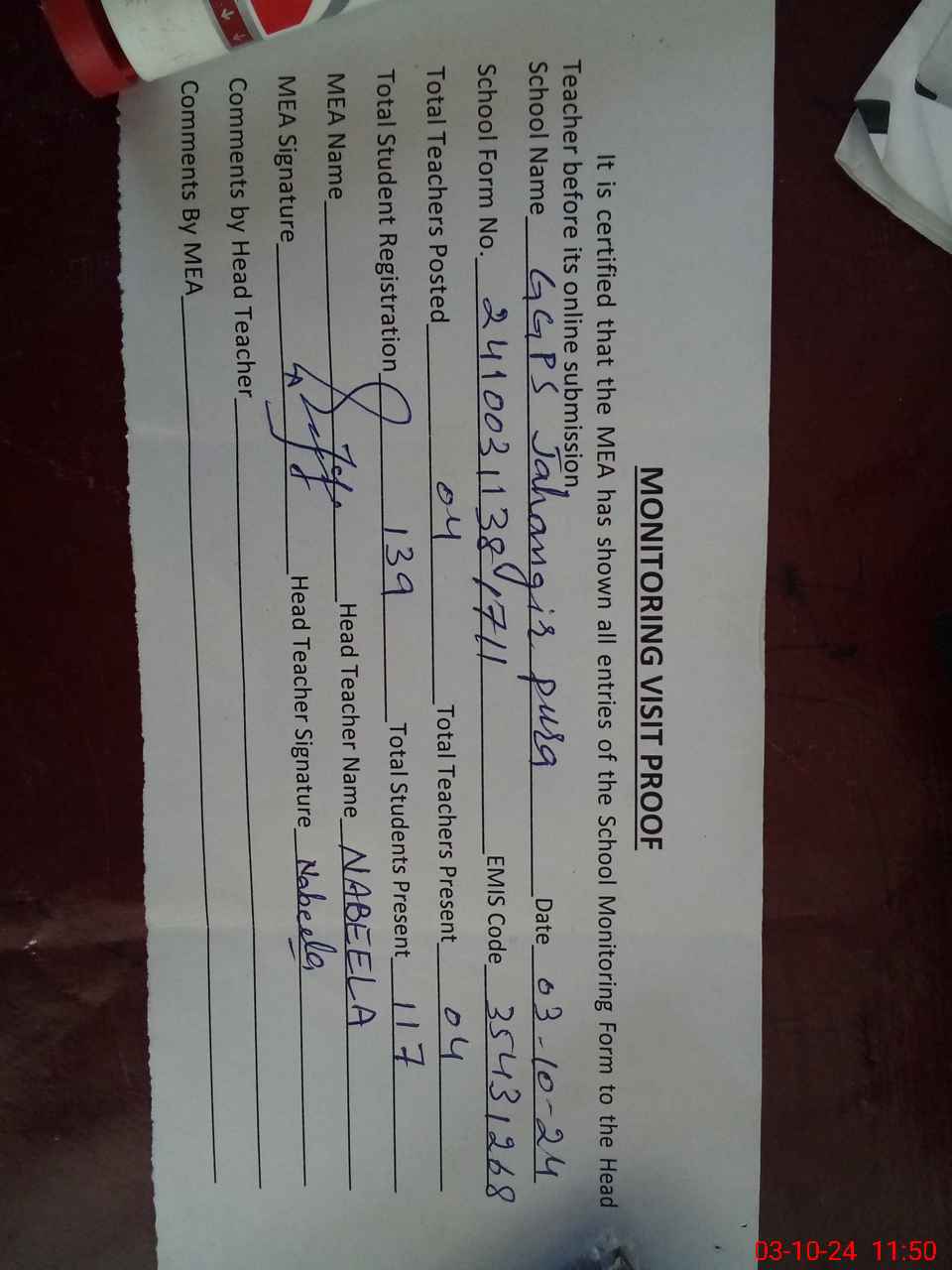 | Attendance Register | Head Teacher | MEA with School | Visit Proof |