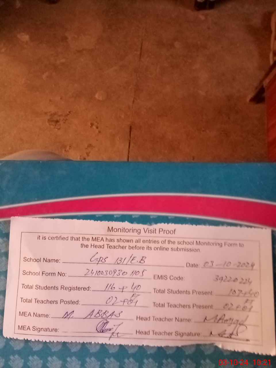 | Attendance Register | Head Teacher | MEA with School | Visit Proof |