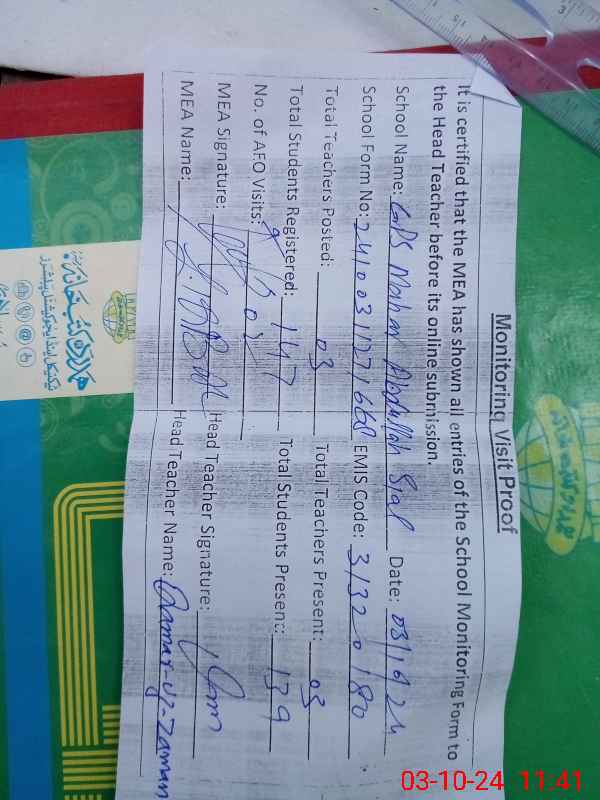 | Attendance Register | Head Teacher | MEA with School | Visit Proof |