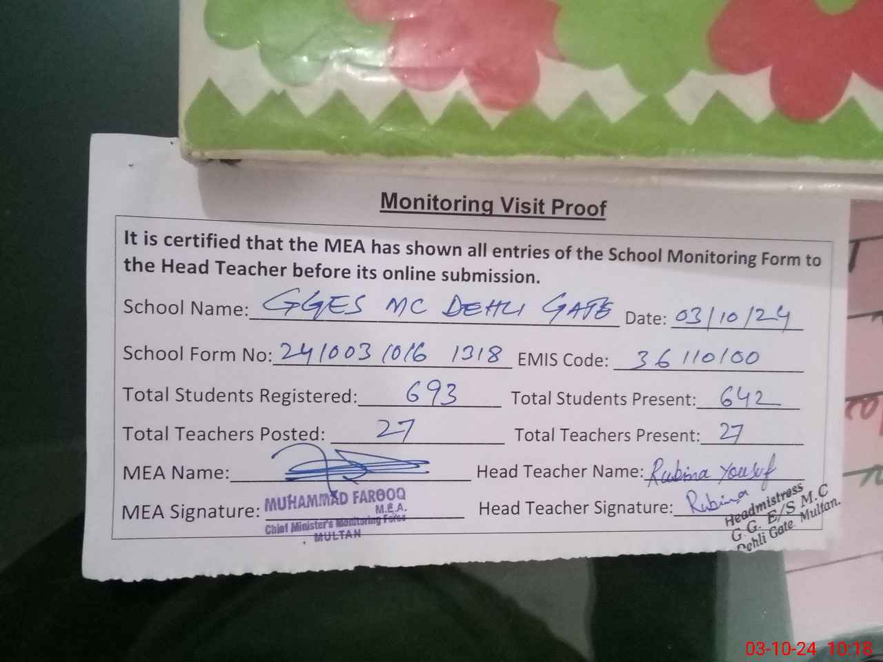 | EMIS Code: 36110100 | Name of School: GGES MC DEHLI GATE MULTAN | |||